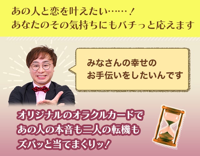 オリジナルの「天使からの贈り物オラクルカード」と独自の姓名判断を組み合わせたオリジナル占術で、運気の変化や周囲の人の気持ち、訪れる転機などを詳細に鑑定します。