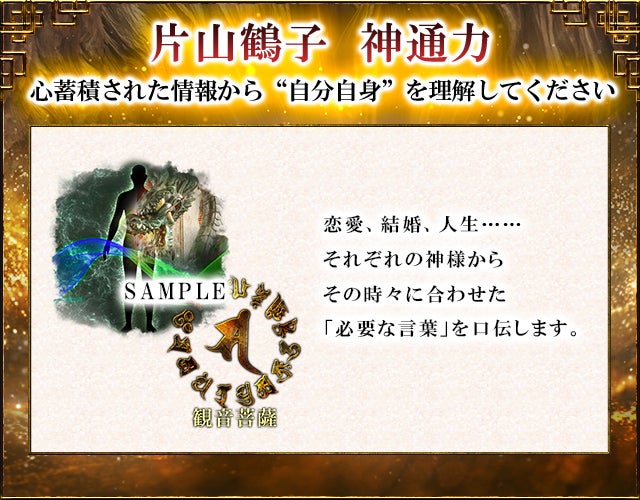 その時々に合わせて訪れる神様からの言葉を口伝していきます。恋愛、結婚、人生……それぞれを守る神様があなたの「今」や「今後」についてお伝えしていきます。大日如来・不動明王・釈迦如来・龍神様・愛染明王などの力を借りて、今必要な言葉をお伝えしていきます。