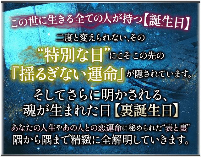 肉体が生まれた日である「誕生日」に対し、魂が生まれた日である「裏誕生日」からは、当事者でもなかなか認識することのできない「本性」や「裏の顔」を知ることができます。ここでは、本当のあなたの姿や、知られざるあの人の本性について、精緻に解き明かしてきます。