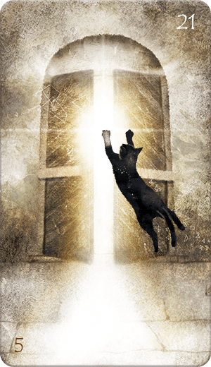 あなたのために出てきたカードには、「ずっと開かなかった扉が数センチ開いたところをめがけて猫が思いきってジャンプをしている様子」が描かれています。